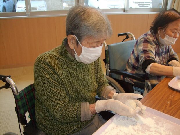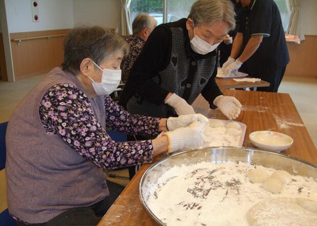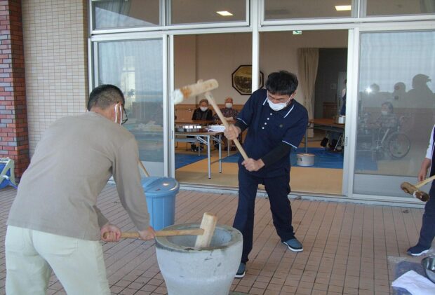 12月28日、 今年も季節を感じるこの行事をご入居者様に楽しんでいただきました。地域交流スペースの中央にはブルーシートを敷き、外のテラスに杵と臼を準備。良い時間をお過ごしいただきました。