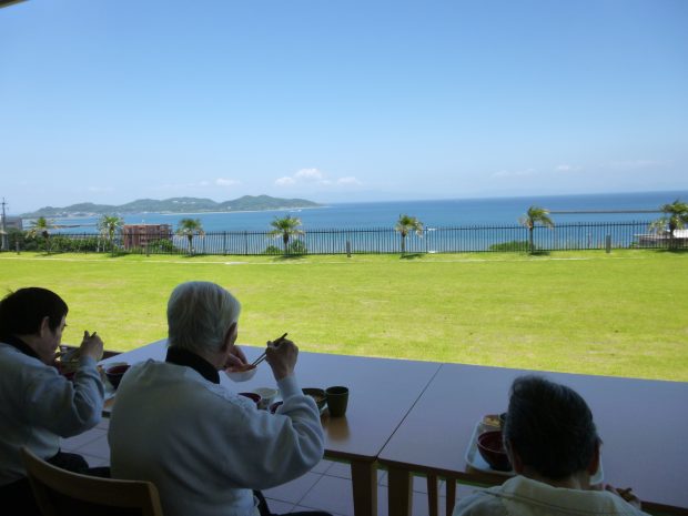5月26日テラスにて昼食をとりました。天気も良く素敵な景色を見ながらの食事はいつもとは違う雰囲気でみなさん喜ばれていました。