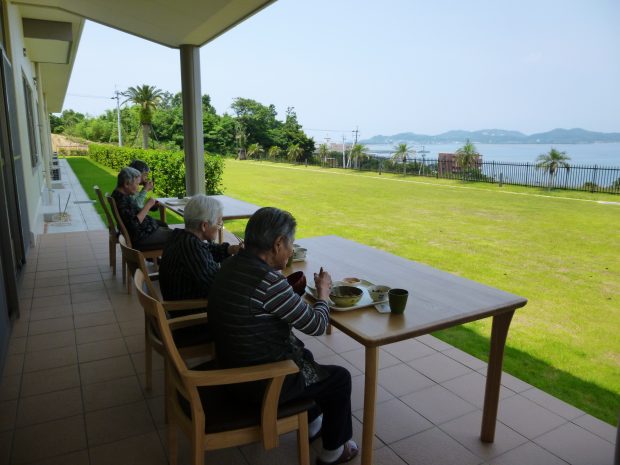 6/19 梅雨の晴れ間にテラスで昼食を取りました。眼下に広がる天草の海を眺めながらの食事は、話しも弾み笑顔が零れていました。