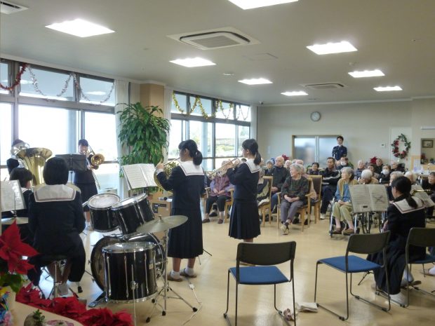 12/15(土)クリスマス・忘年会を開催しました。ボランティアに苓北中学校吹奏楽部11名の皆さんが来園、迫力ある演奏を披露していただきました。