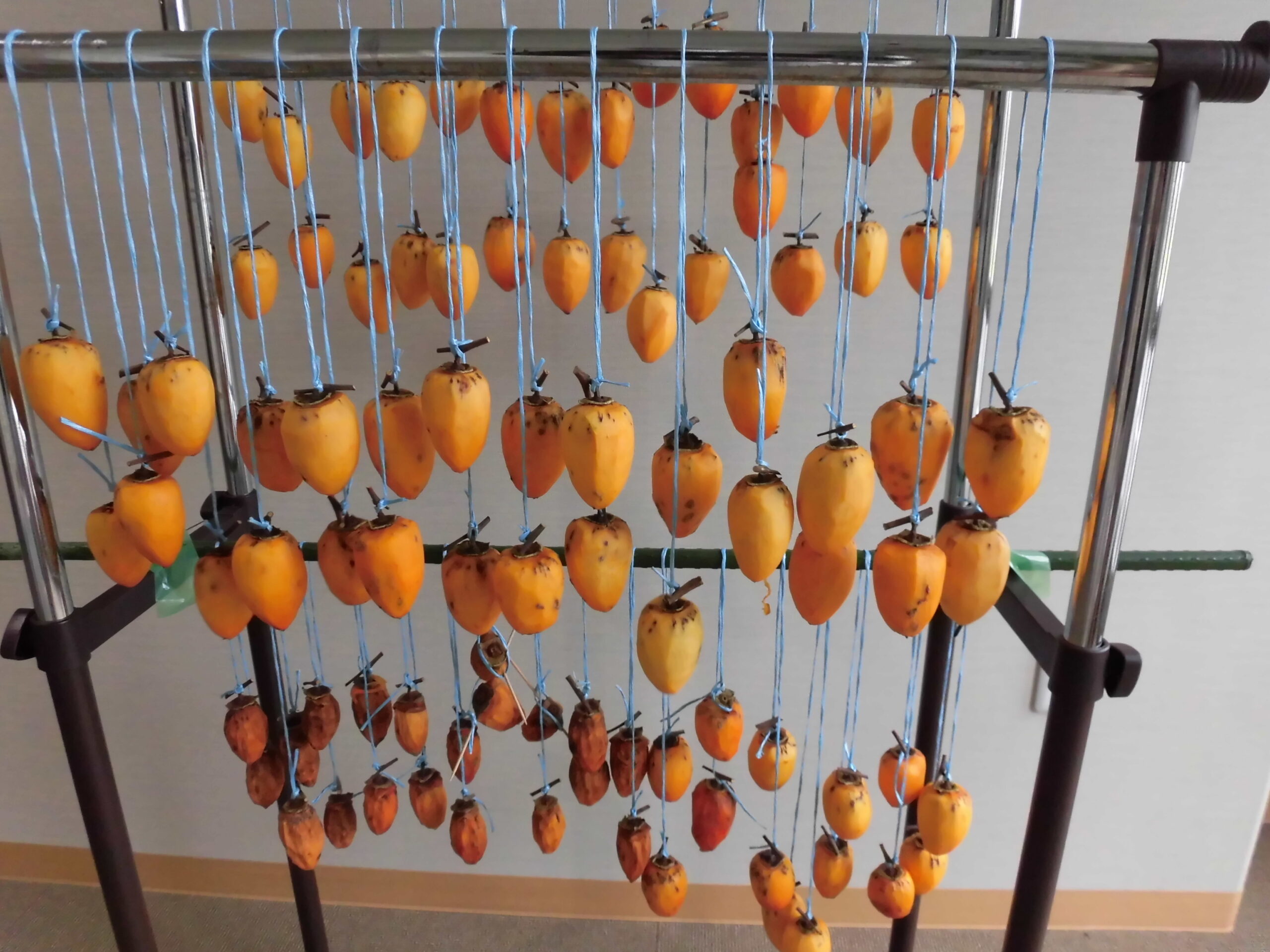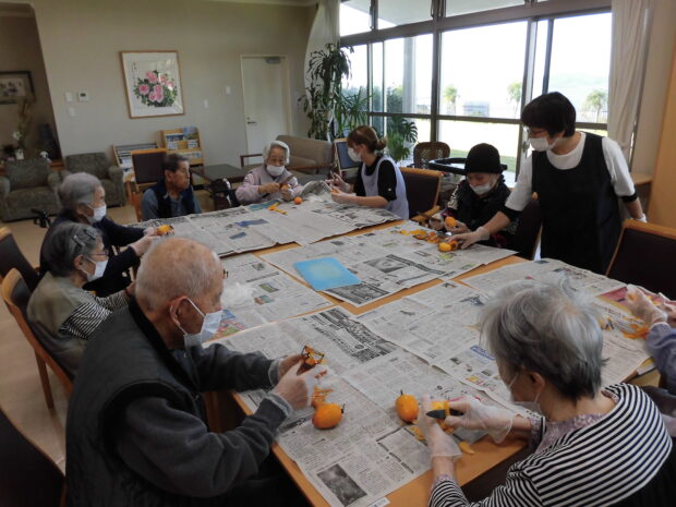 利用者の皆様と一緒に干し柿を作りました。利用者様は手慣れたもので上手に皮をむき紐をくくりつけおられました。食べれるようになるまで時間はかかりますが、待つのも楽しみの一つ。 美味しい干し柿になるまで楽しみに待ちましょう!